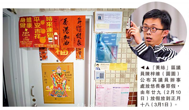 今日年初五是牛年首個工作日,不少市民開工大吉,然而多名「黃絲」區議員繼續大放悠長假期。當中能力備受各方質疑的「黃絲」區議員陳梓維,雖然人在香港,竟公布其議員辦事處由年廿九(2月10日)放到正月十八(3月1日),足足19日長假。另...[详细]