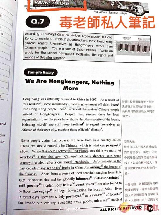 近年學校教材經常被揭發漏洞百出,抹黑內地、歪曲事實的情況屢見不鮮,受教育局監管的日校尚且如此,「冇王管」的私人補習社情況更令人擔心。近日有家長群組流傳一份出自補習社的英文作文教材,範例文章提及內地情況時多次出現「locusts(...[详细]