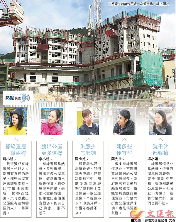 行政長官林鄭月娥建議將專為綠表公屋戶而設的綠置居計劃恒常化,並把位於火炭的4,800個公屋單位轉作綠置居出售。消息指,房屋署建議將綠置居計劃恒常化,在本年底推出下個項目,單位折扣較同年推售的居屋銷售高一折。[详细]