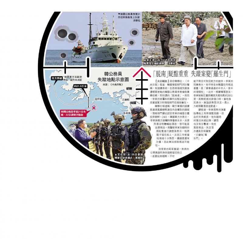 綜合韓聯社、《中央日報》報道:韓國情報部門25日聲稱,有證據表明,在西部海域失蹤後遭朝軍射殺的韓國公務員李某確係棄韓投朝,即所謂的「脫南者」。然而,李某的家屬和同事均反駁此說法,並質疑軍方和情報部門在推卸責任。 [详细]