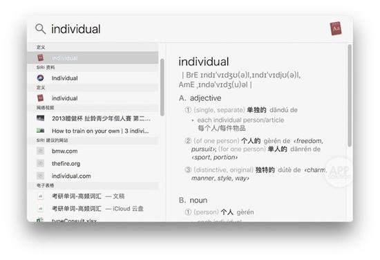 如果妳是Mac用戶,那麽妳一定知道macOS中內置了一個「詞典」App,同時如果妳在聚焦搜索(即Spotlight Search)中輸入一個單詞,「詞典」的結果也會展示在其中,非常方便。 [详细]