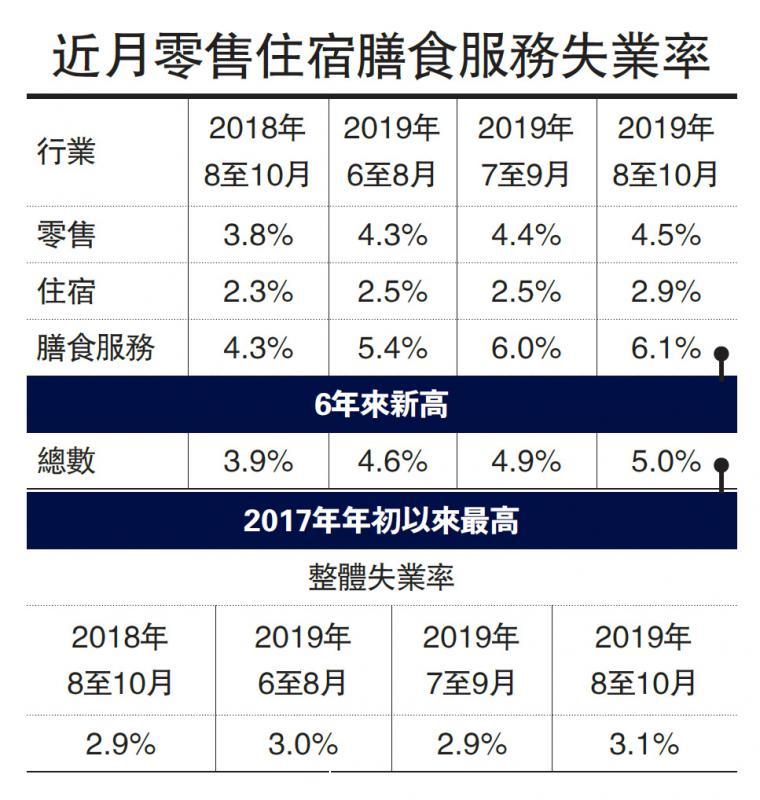 黑暴拖垮本港經濟,失業率再度攀升。政府昨日公布最新失業率,整體失業率為3.1%,比7至9月上升0.2個百分點,其中消費及旅遊相關行業失業率進一步上升至5%,逾三萬人失業,繼續破2年多來紀錄;餐飲服務活動業失業率上升至6.1%,為超過六...[详细]