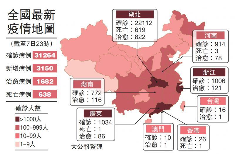 內地新型冠狀病毒疫情持續擴散,截至11日24時,在疫情最嚴重的湖北省,過去一日再多94人死亡,全省死亡病例突破一千,增至1068人死亡,內地累計死亡病例就達到1110宗。湖北省新增多1638宗確診病例,是超過一星期之來,首次單日確診宗數...[详细]