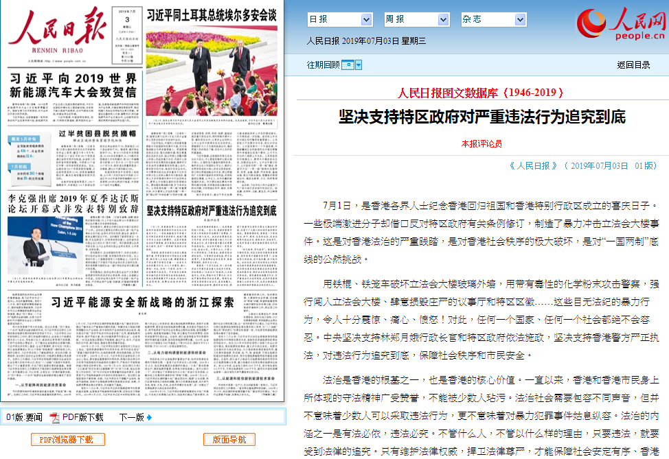 人民日報:堅決支持特區政府對嚴重違法行為追究到底