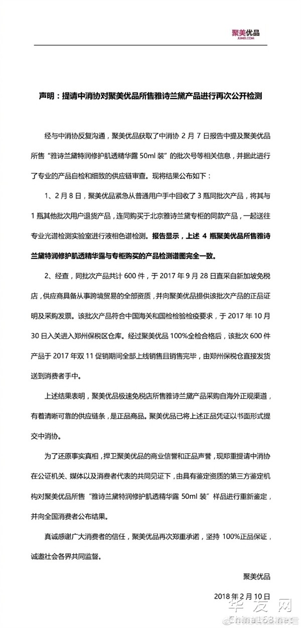 聚美優品發佈聲明:提請中消協對問題商品再次檢測