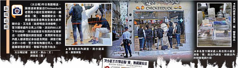 《大公報》昨日專題報道,踢爆連鎖童裝店Chickeeduck老闆周小龍在荃灣開新店,繼續販「獨」,無視國安法,他更囂張揚言會再在全港九新界開分店,又冷言「政府唔依法律做嘢」。警方國安處昨日馬上行動,派出約60人於下午5時許,持法庭搜查...[详细]