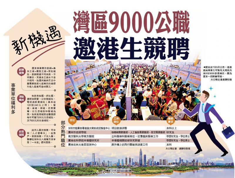 廣闊天地/灣區9000公職 邀港生競聘粵港澳大灣區事業單位公開招聘港澳畢業生。近日,廣東省委組織部、廣東省人力資源和社會保障廳聯合發布公告稱,將提供2萬餘個事業單位編制崗位,公開招聘高校畢業生。其中,港澳畢業生可報考廣州、深圳等珠三角9市及省直駐上述各地事業單...[详细] 2021-07-08 14:42 分类:即 時