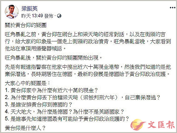 ■CY提出五問題,認為黃台仰走佬太多巧合。黃台仰在獲德國政府「難民庇護」的消息曝光後,不少其原先的支持者都批評他「出賣梁天琦」。率先披露「難民庇護」訊息的英國《金融時報》香港記者近日稱,黃台仰曾向她透露[详细]