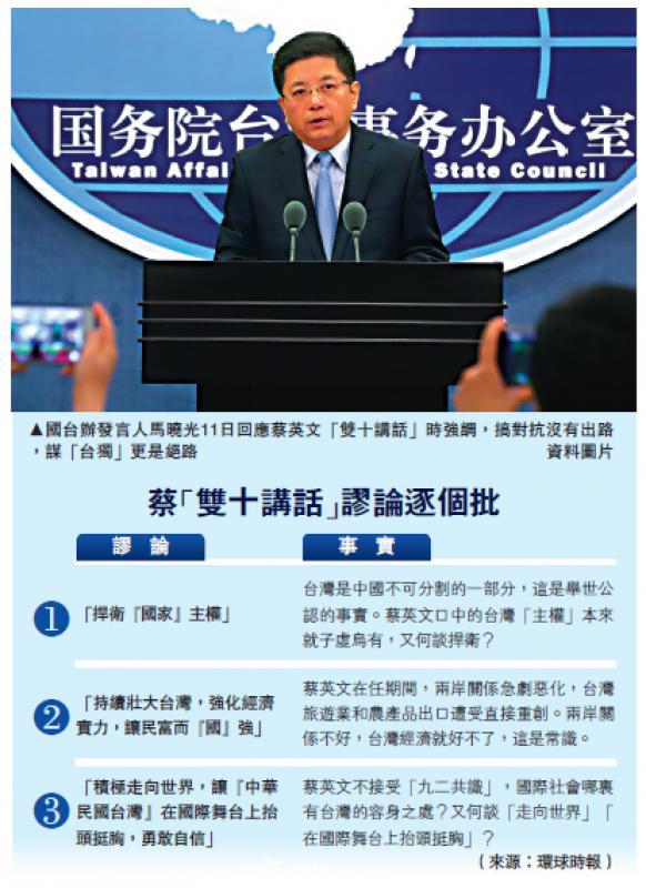 針對民進黨當局領導人蔡英文10月10日涉及兩岸關係的言論,國台辦發言人馬曉光11日表示,這一講話充斥着對抗思維和敵對意識,企圖藉污衊攻擊「一國兩制」製造仇視大陸的氛圍,壓制台灣民眾希望發展經濟、改善民生、緩和兩岸關係的主流民意...[详细]