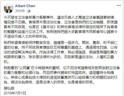 大批示威者衝入立法會大樓肆意破壞,基本法委員會委員、港大法律學院教授陳弘毅今晚在個人Facebook賬戶撰文,形容情況慘不忍睹,強調是違反法治、人權和正義。他又批評公民黨發表的聲明沒有譴責暴力衝擊行為,反而歸咎政府,是「法律人的...[详细]