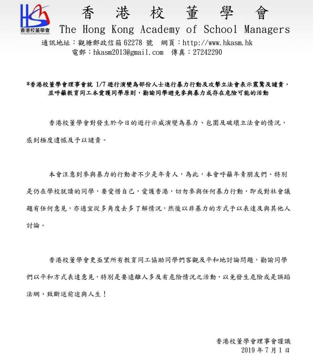 香港校董學會理事會發布聲明譴責暴力行動