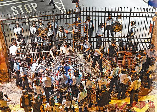 ■警員清理鐵馬陣。法新社 塗鴉噴牆臭蛋遍地 害苦清潔工執爛攤 灣仔警察總部三座建築物遭示威者的16小時摧殘和破壞,昨晨當示威者散去後,警察總部如同經過「暴徒式」的洗禮,一片滿目瘡痍,警徽被黑漆噴黑、外牆被[详细]
