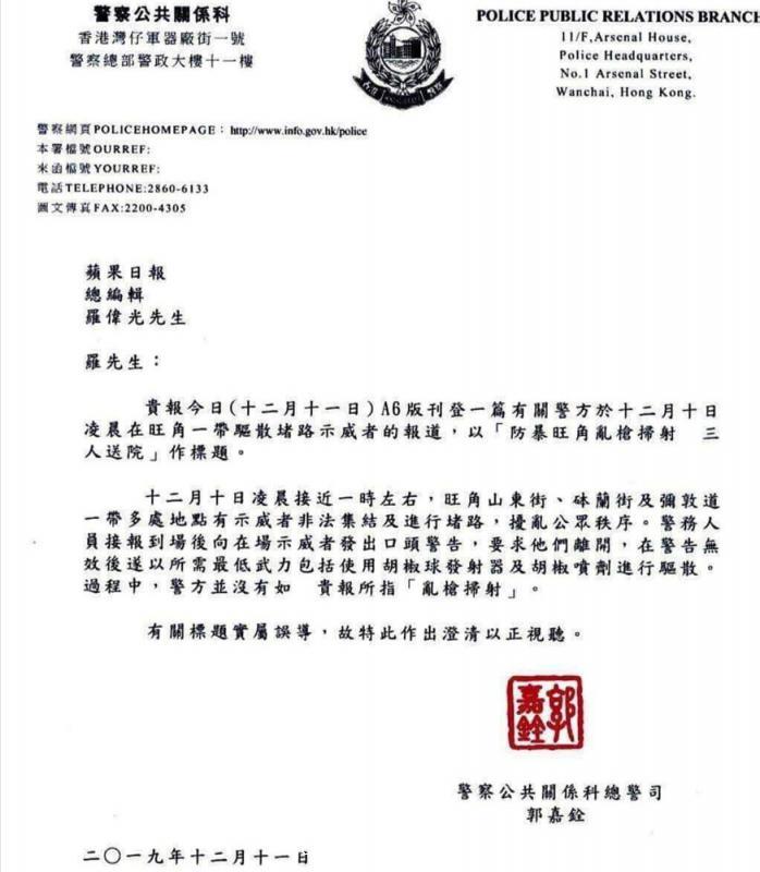 屢因假新聞惹官非的《蘋果日報》,又再惡意抹黑警方,誤導市民。12月10日凌晨警方在旺角一帶驅散堵路暴徒,《蘋果》翌日報道該宗暴亂新聞,標題竟為「防暴旺角亂槍掃射,三人送院」, 警方強調,當時是在警告無效後,以所需最低武力包括使...[详细]