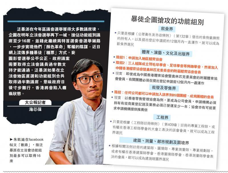 泛暴派在今年區議會選舉獲得大多數議席後,企圖在明年立法會選舉再下一城,搶佔功能組別議席至少16席,並藉此繼續為特首選委會選舉鋪路,一步步實現他們「顏色革命」奪權的陰謀。近日網上流傳多種暴徒「種票」方式,妄圖影響選舉公平公正...[详细]