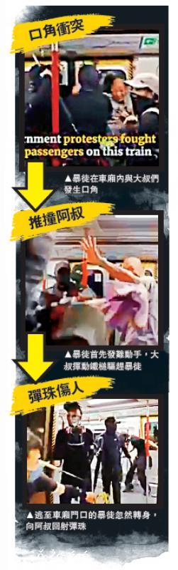 8月31日港鐵太子站車廂內鐵槌大叔抵抗黑衣暴徒襲擊事件,網上有新片流出,從不同角度拍攝到,黑衣暴徒與車廂內幾名大叔起爭拗,多名暴徒圍毆大叔,更用丫叉從車廂門邊近距離向大叔射擊彈珠,大叔們生命受嚴重威脅,其中一名大叔迫不得已...[详细]
