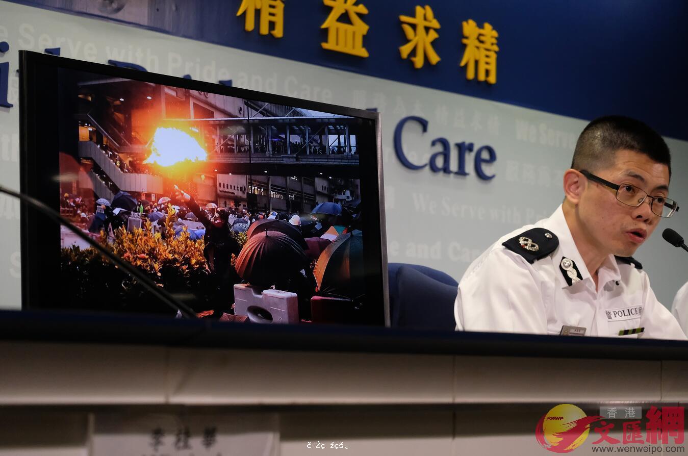 警方展示圖片,暴徒扔汽油彈險傷記者。 香港警方今日(26日)召開例行記者會。警方表示,上周末非法活動中共拘捕86人,其中2人於上周六東九龍涉嫌參與暴動,2人於上周日涉嫌參與非法集結,今日下午分別在觀塘裁判法[详细]
