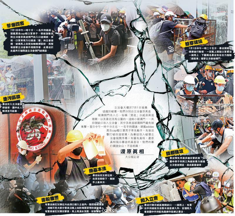 立法會大樓於7月1日被暴徒瘋狂破壞,他們分別由立法會添美道玻璃側門出入口、俗稱「煲底」示威區兩道捲閘,以及靠近添馬公園的一道細小玻璃門,一共四個缺口攻入立法會;其中添美道玻璃側門最先被衝擊。當日中午一時十分左右,一名手持鐵...[详细]