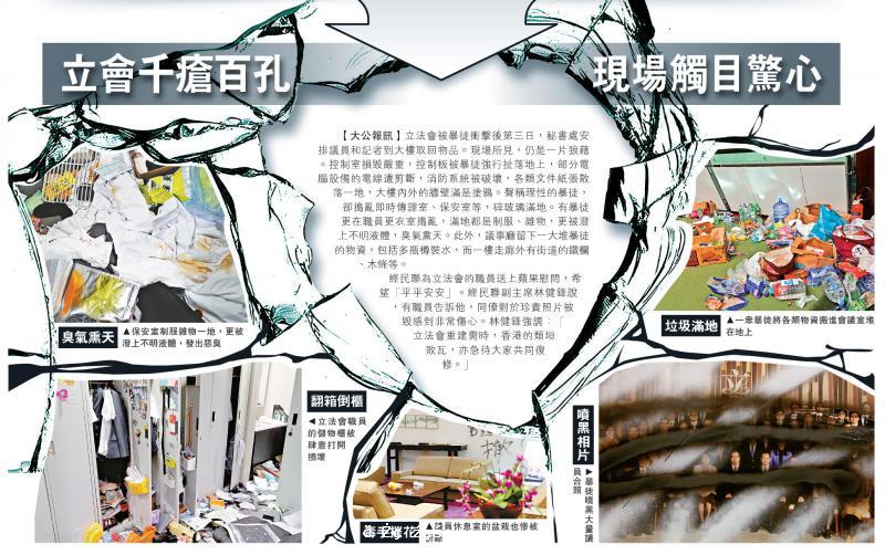 立法會被暴徒衝擊後第三日,秘書處安排議員和記者到大樓取回物品。現場所見,仍是一片狼藉。控制室損毀嚴重,控制板被暴徒強行扯落地上,部分電腦設備的電線遭剪斷,消防系統被破壞,各類文件紙張散落一地,大樓內外的牆壁滿是塗鴉。聲...[详细]