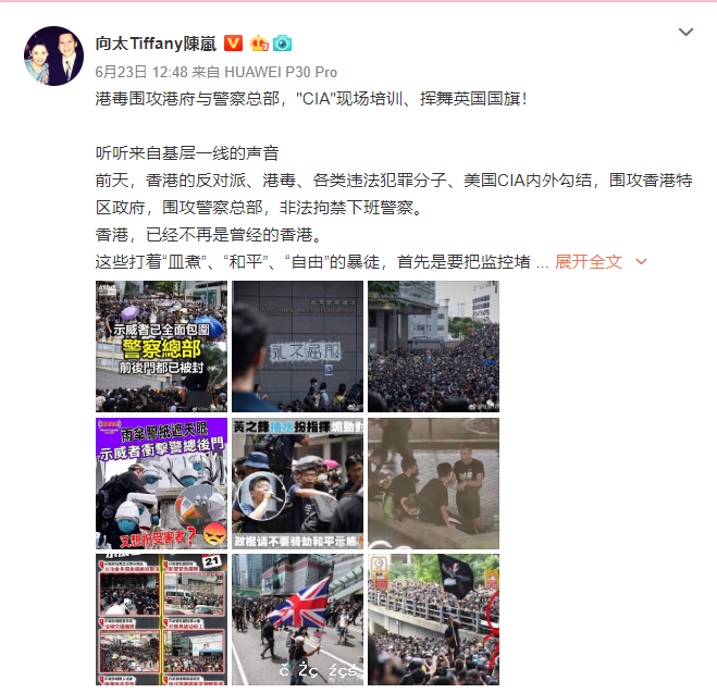 上周五大批示威者在香港多個政府部門製造混亂、干擾服務,更包圍灣仔警察總部。香港著名電影出品人和製片人向華強的太太陳嵐在微博上發表千字文,對此次事件表示痛心難過,並痛斥「港毒」暴徒、西方媒體、CIA等搞亂香港行為。 [详细]