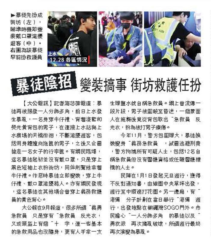 亂港分子去年12月28日在上水搗亂破壞,其間屢次搶奪、踢撞旅客行李篋。《大公報》上月29日、30日接連踢爆,當日有至少兩名亂港分子穿黃背心扮成所謂「義務急救員」,有份搶、踢行李篋。警方昨日證實拘捕一人。 [详细]